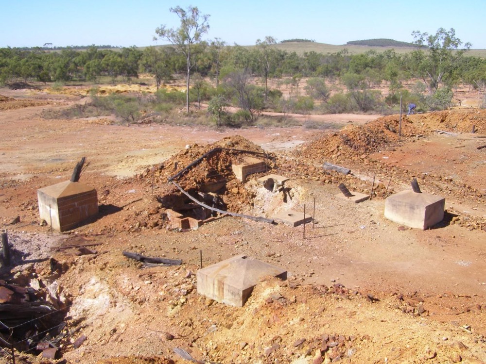 The remains of the centrally located main shaft with the four massive concrete foundations for the poppet head.