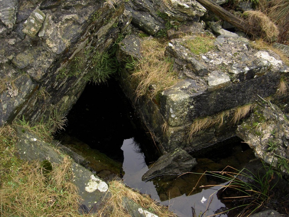 Main shaft just beside the engine house. Part of the engine house wall fell down near the shaft. The shaft is flooded to the top, but looks pretty deep
