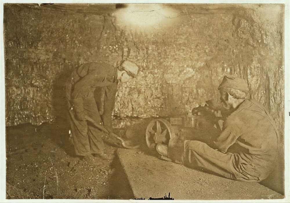 Man with punching machine to drill into coal. Boy shovels out 10 hrs. daily.
