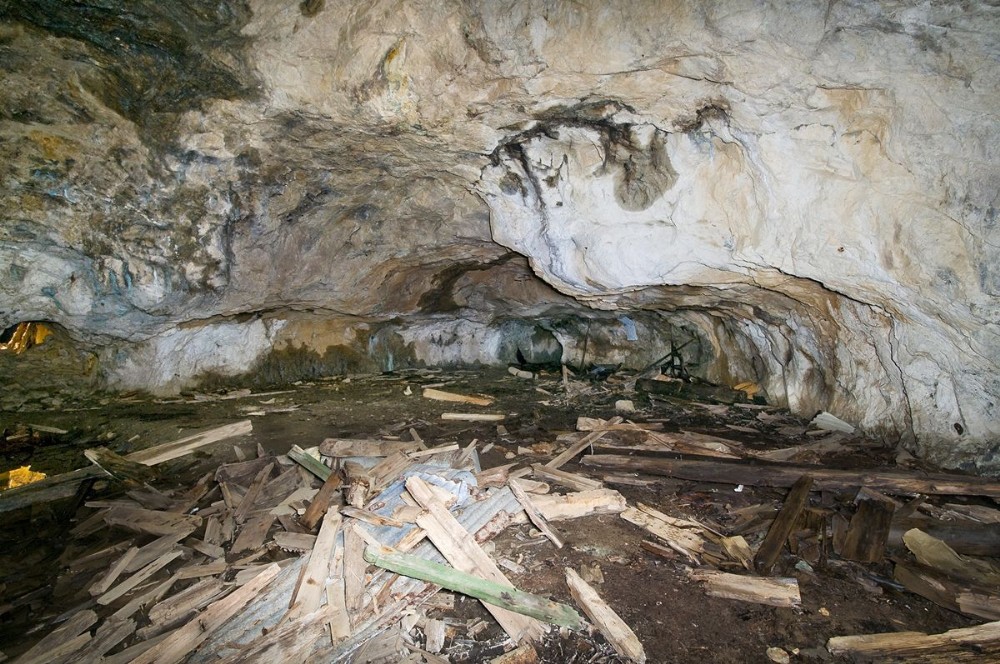 The debris and remains of the 1950s building in the Man Engine chamber (South East & West Lode) looking South from concrete base of 1950s winder. [October 2012]