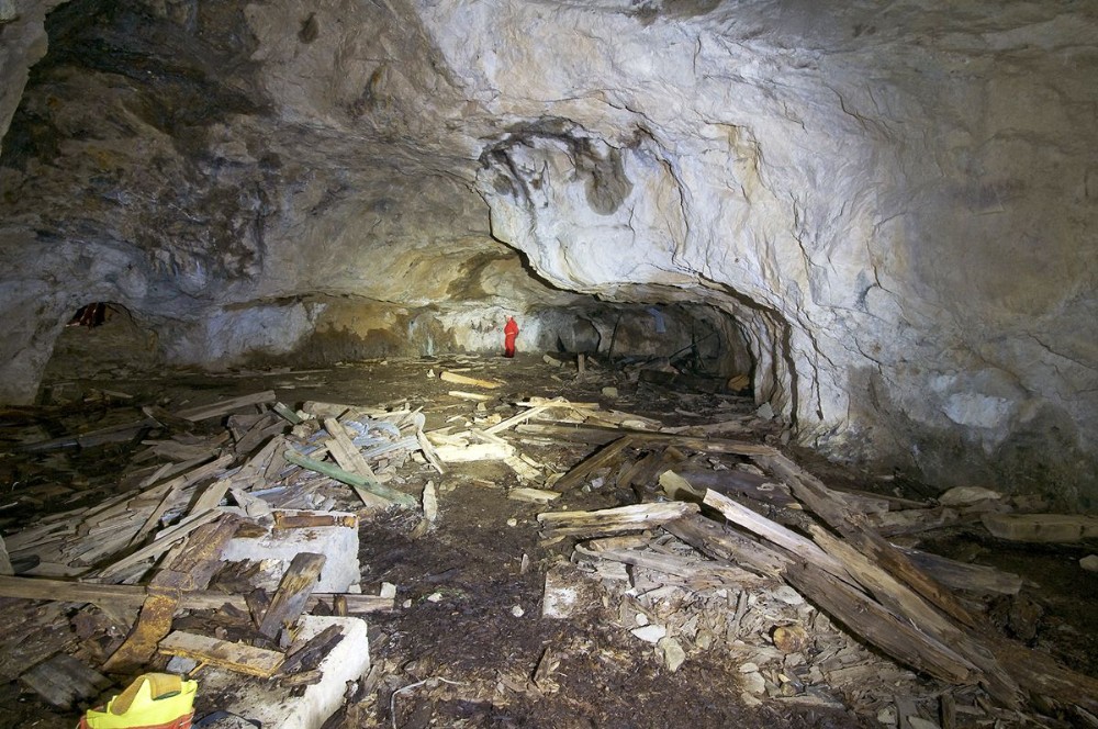 The debris and remains of the 1950s building in the Man Engine chamber (South East & West Lode) looking South from concrete base of 1950s winder. [October 2012]
