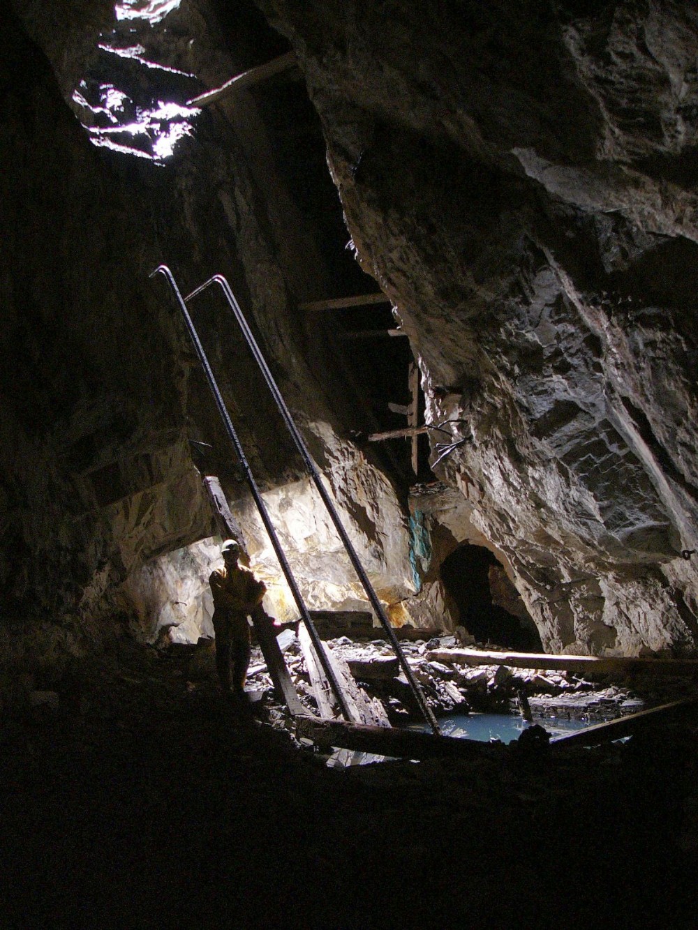 Man engine shaft at adit level. The rails are the begining of the skip road installed in the 1950's. The shaft is over 1,500ft deep and is flooded below adit level.