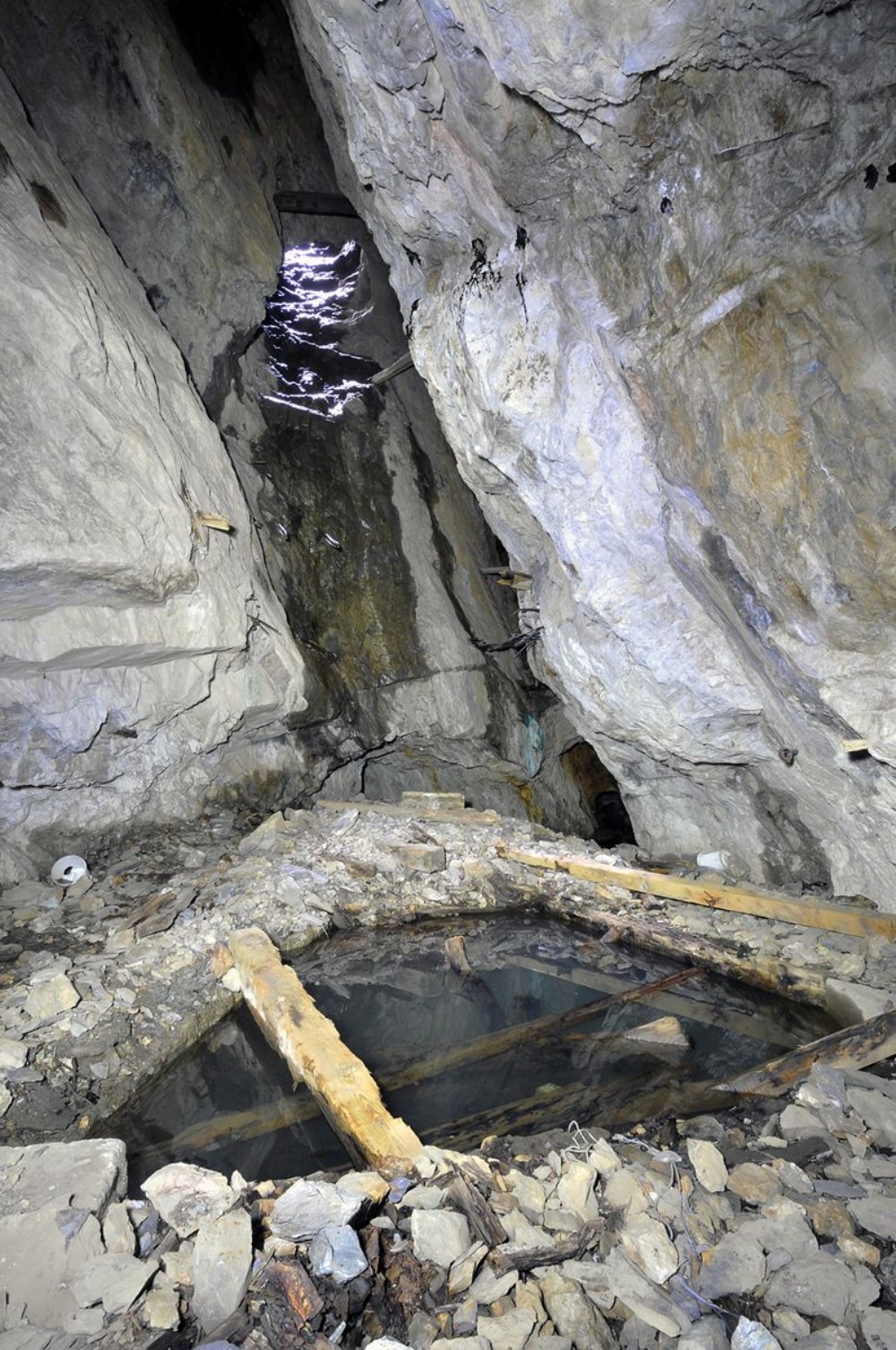 View (West) from the Man Engine chamber (South East & West Lode) looking across the flooded Man Engine shaft (used as a skip-way in the 1950s) up the Man Engine shaft to surface. [October 2012]