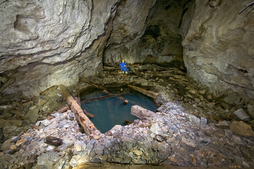 View East along the South East & West Stope across the Man Engine shaft. Figure is sitting on the concrete foundations of the 1950s winder, Main Adit. [October 2012]