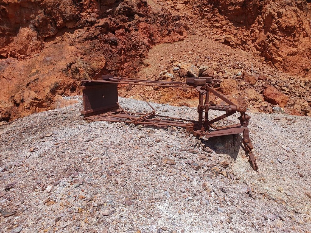 The frame of an old man carrying skip lies on its side but is in surprisingly good condition. One side of the gate has been removed.