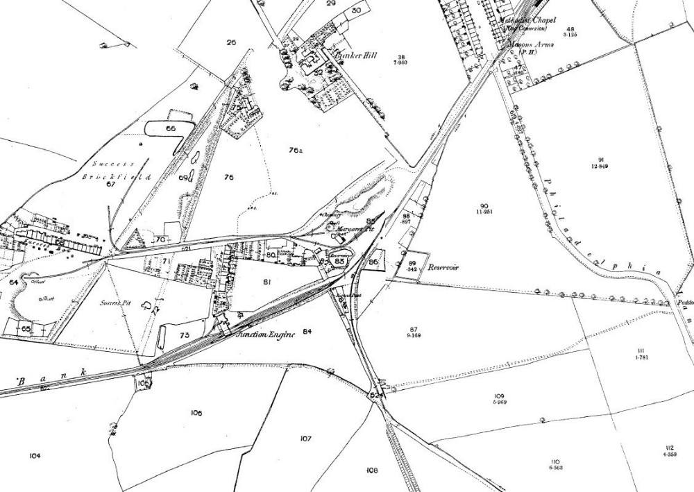Showing the Success Pit to the top Left, note how the main railway linking both mines ran through the street and the triangle part in the centre formed by the different directions of wagon way is marked Reservoir, This prominent and built up area still remains and is a reminder of its past. Both mines had two shafts. also the large haulage engine to pull the heavy trucks up from the Lambton Pits, It is possible that Stationary engines were dotted along the Wagon way to Sunderland before Steam engines came into play ! The line leading off to the bottom was to the Houghton colliery.