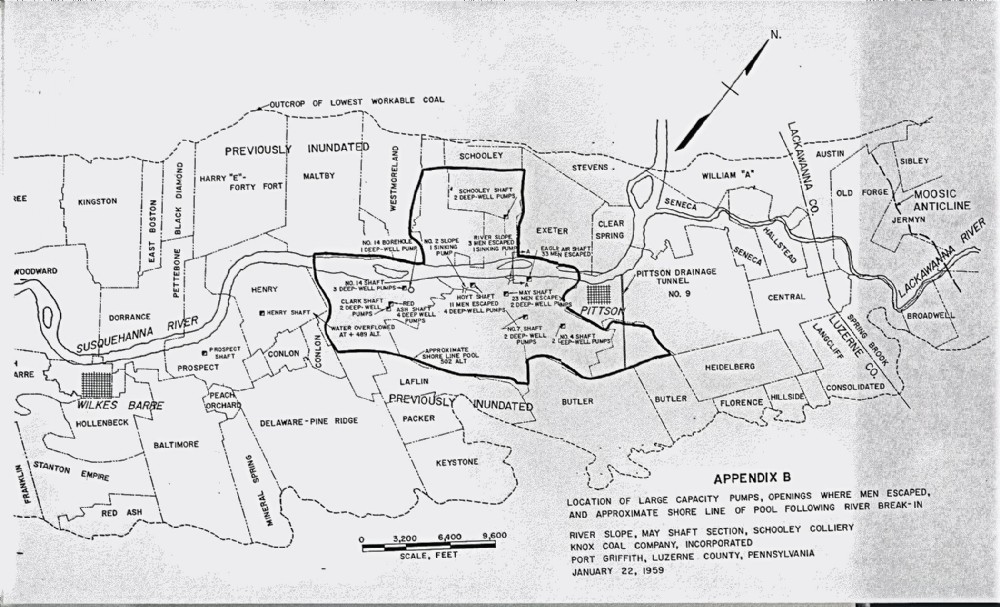 Map of Knox Mine disaster showing inundated area and shafts used for escape and dewatering.