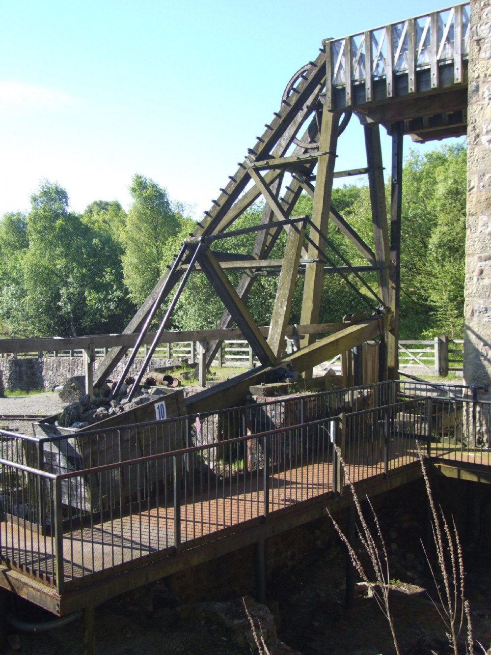 Reconstructed balance bob with king and queen posts, headframe in background.