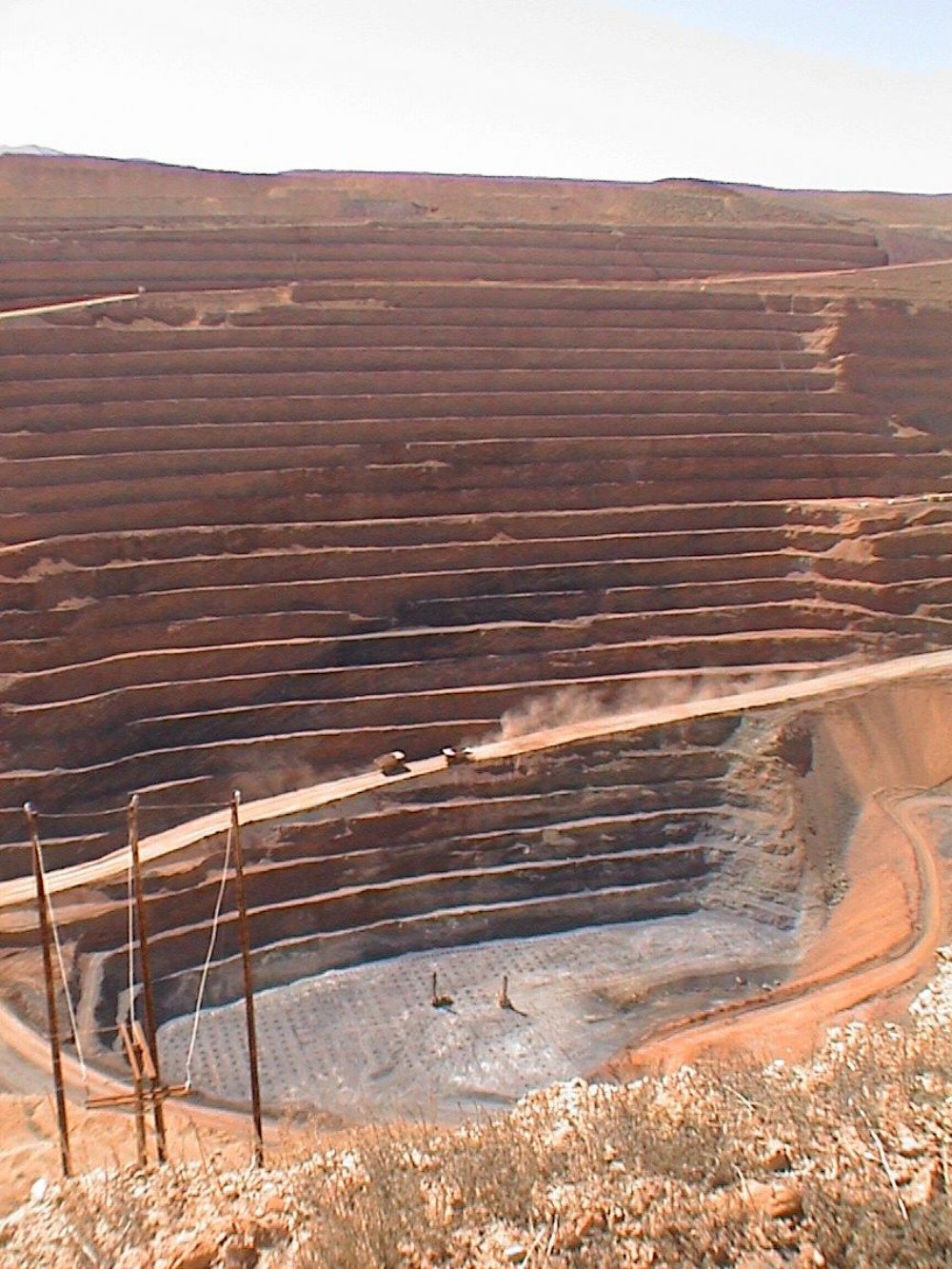 Newmont's Twin Creeks Mine Megapit showing dark gray, high grade, sulfide ore in bottom of pit, with reddish oxidized ore overlying sulfide ore. Courtesy of NBMG>