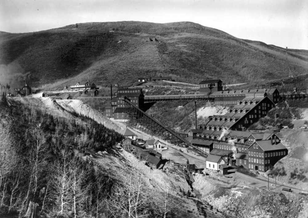 Daly West mine office, shaft and mill in middle, Daly-Judge shaft in background at center ground, Summit County, Utah. Circa 1904
