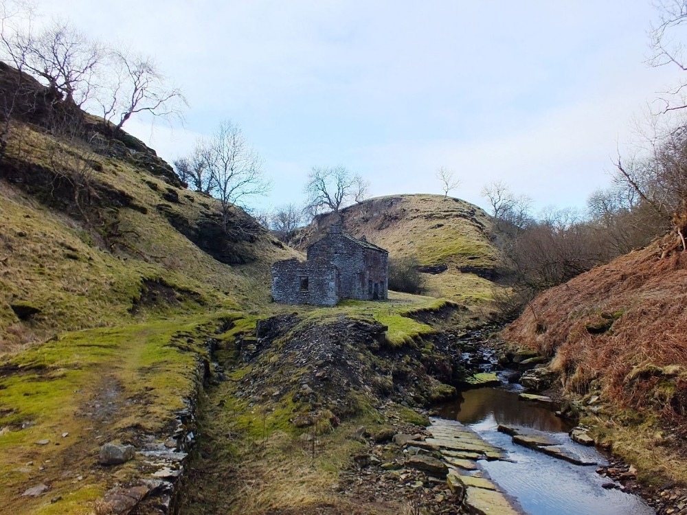 View looking up to the mine site with the mine shop and the level (horse?) in front