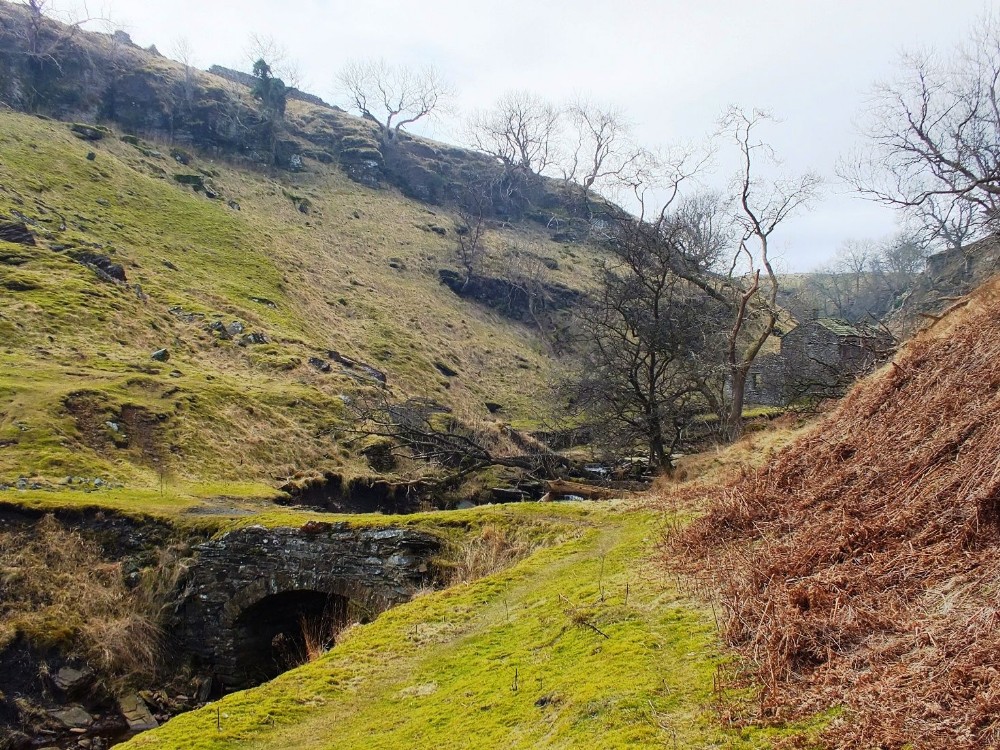 View looking towards the mine site & shop from the tramway/route across the bridge to the mill & bouse teems.