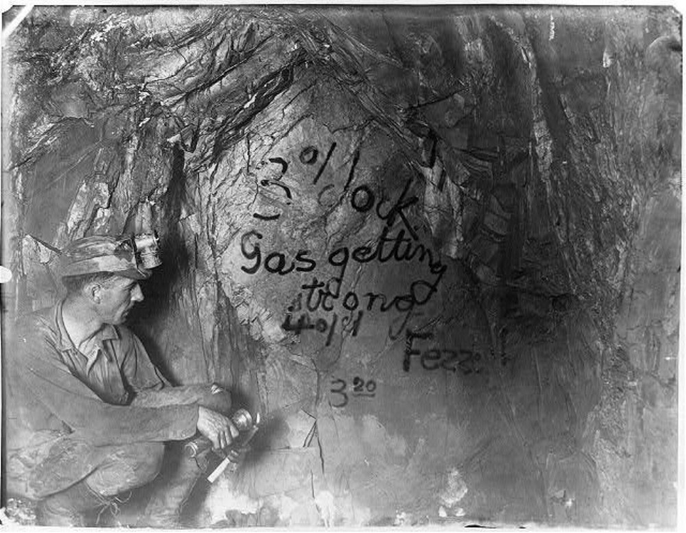 The last message left by 47 entombed miners in Argonaut [gold] Mine, Jackson, Calif. Written with carbide lamps on the face of the 4350 foot drift.