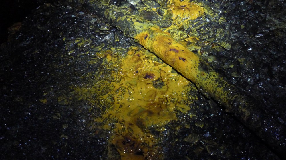 We came upon interesting yellow and orange deposits in the vicinity of one of the roofing shafts down into the Oakeley workings on floor E back vein.
