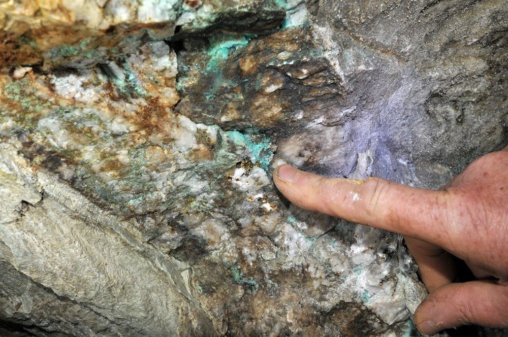 Minerals (malachite, chalcopyrite) on the wall of the branch into Man Engine Chamber on the main adit level. [October 2012]