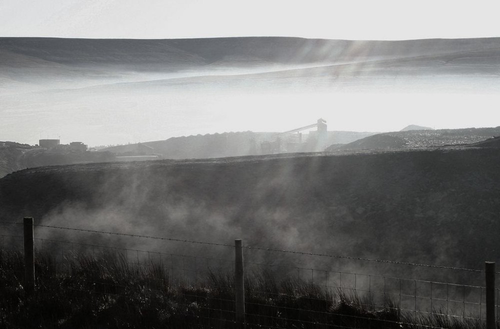 Water evaporating from the quarry face in the sun and rising as mist.