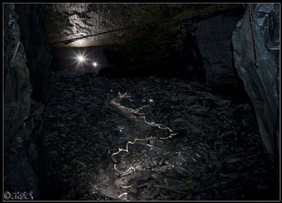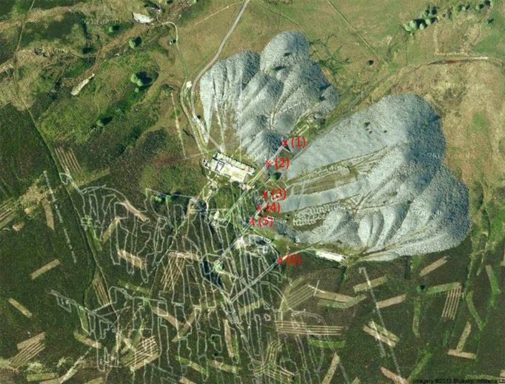 Moel Fferna mine plan overlay on Google Maps surface photograph.