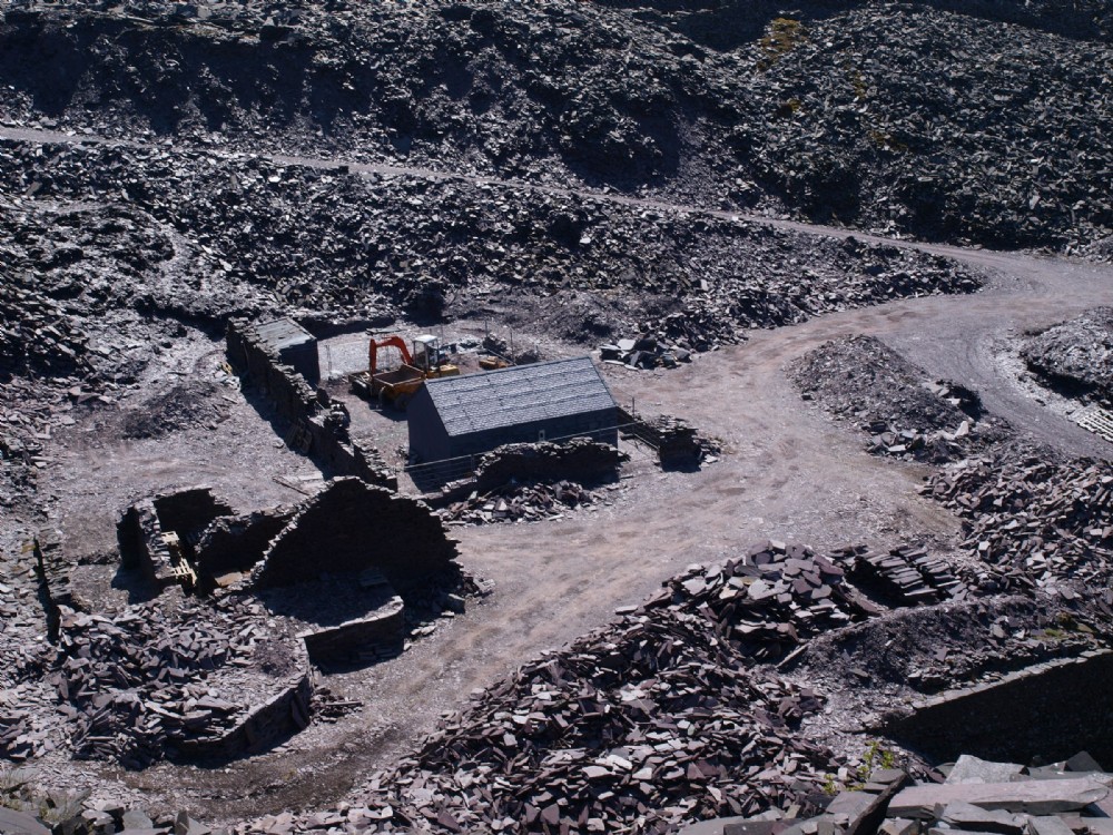Another view (from the N.) of the ruined lower mills area and the modern, film set buildings.