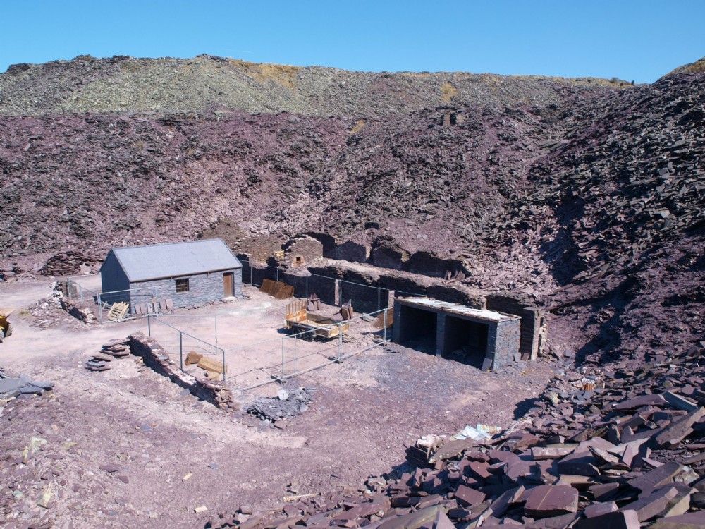 View from SW. of the remains of the lower mills area. The building on the left is a modern facsimile of a caban, those on the right, of gwalau (used for cutting slate) both being made of G.R.P. and used in the filming of the television programme "A Snowdonia Farmhouse".