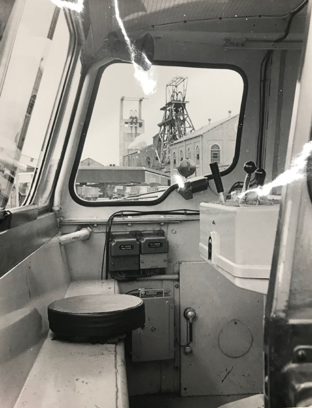 Inside of diesel locomotive cab.