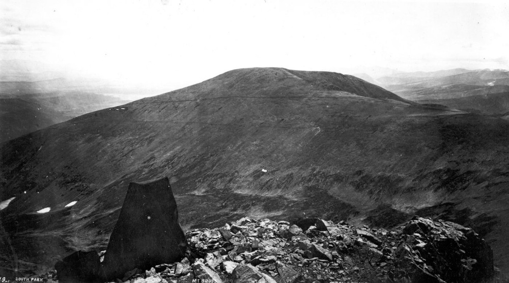 This view was taken from the summit of Mount Lincoln. Looking south from Mount Lincoln is Mount Bross, long famous for its great wealth of silver-bearing rocks. The small buildings near the summit on the left cover the Moose Mine, richest on the mountain. Its whole face has been plowed and furrowed over by the prospector. Across its face two lines can be traced, the upper, a wagon road that has been constructed from the valley below to the very summit of Mount Lincoln, via the low saddle which separates the two mountains. The lower line is the old "trail" that was traveled by hardy little "jacks," laden with supplies for the miners going up, and with sacks of ore going down. To the extreme left is a portion of South Park, and in the distance on the right the continuation of the range along its axis to the Buffalo Peaks. Park County, Colorado. 1873.