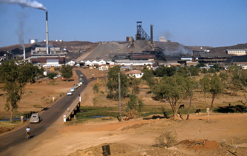 View of surface plant from Townside across dry river Leichardt with disused Urquart headgear on skyline.