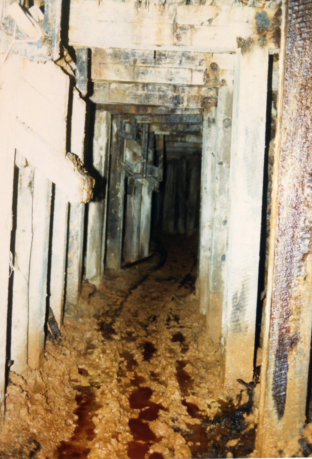 This timberwork is a fine example of their theory put into practice. This was a footwall drive with wooden ore chutes (Cousin Jacks) that they designed so narrow that the sulphide rich ore just cemented itself together in the chutes and boxholes above. Brains..? 1988