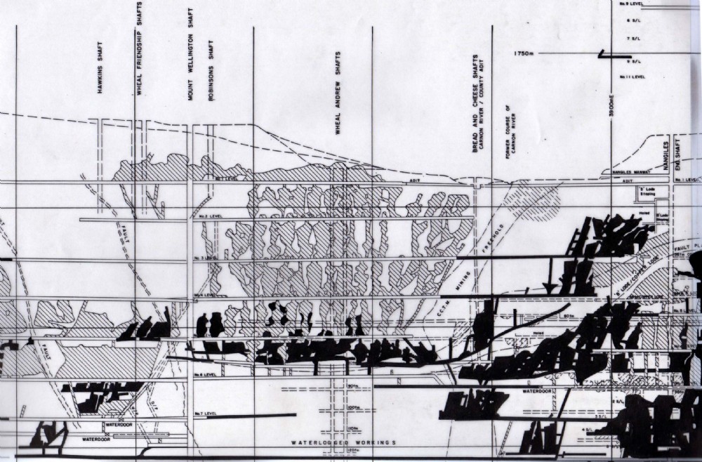 A small section of a large longitudinal section showing the main adit (Now collapsed) and the Nangiles Manway. Various other shafts are shown, notably Bread and Cheese and Wheal Andrew