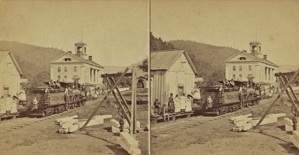 Stereograph showing a locomotive and coal car on the tracks at the railroad depot at Ralston, Pennsylvania, also men, women, and children standing and sitting on a platform, on the railroad cars, and in front of the station building.