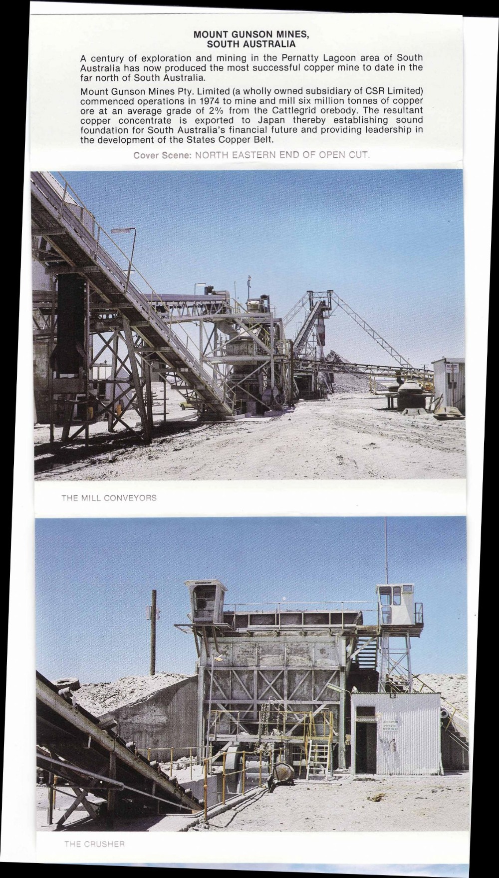 Mt Gunson owned by CSR till 1984 then sold to EMECO and operated till 1986 when it closed and the mill and equipment was sold at auction Aug 1986.