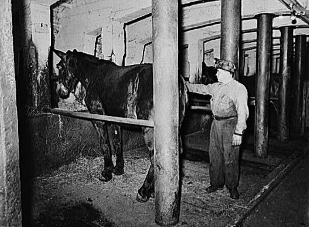 Interior of a mule stable in the Maple Hill mine, seven hundred feet below ground, showing a miner and some mules. Once they go down the mules don't come up until they die. Some have been down for the last twenty-five years.