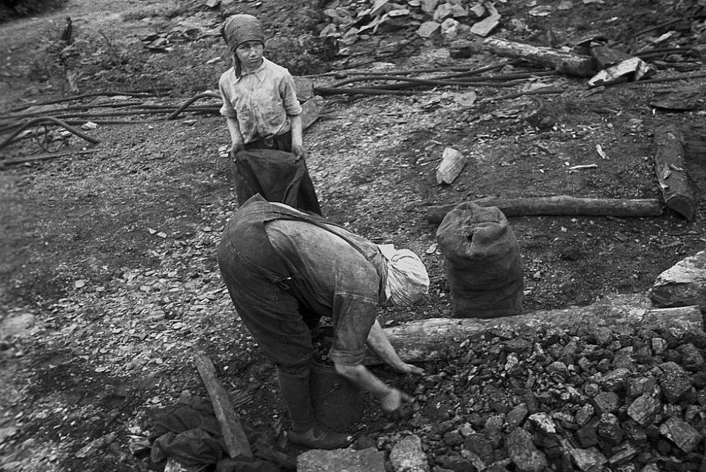 Woman and child picking coal from a slag heap. They were paid ten cents for each 100 pound sack