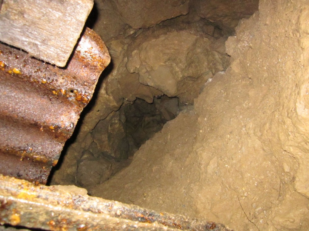 Looking up the rock-filled natural rift above the end of the alcove full of jumble