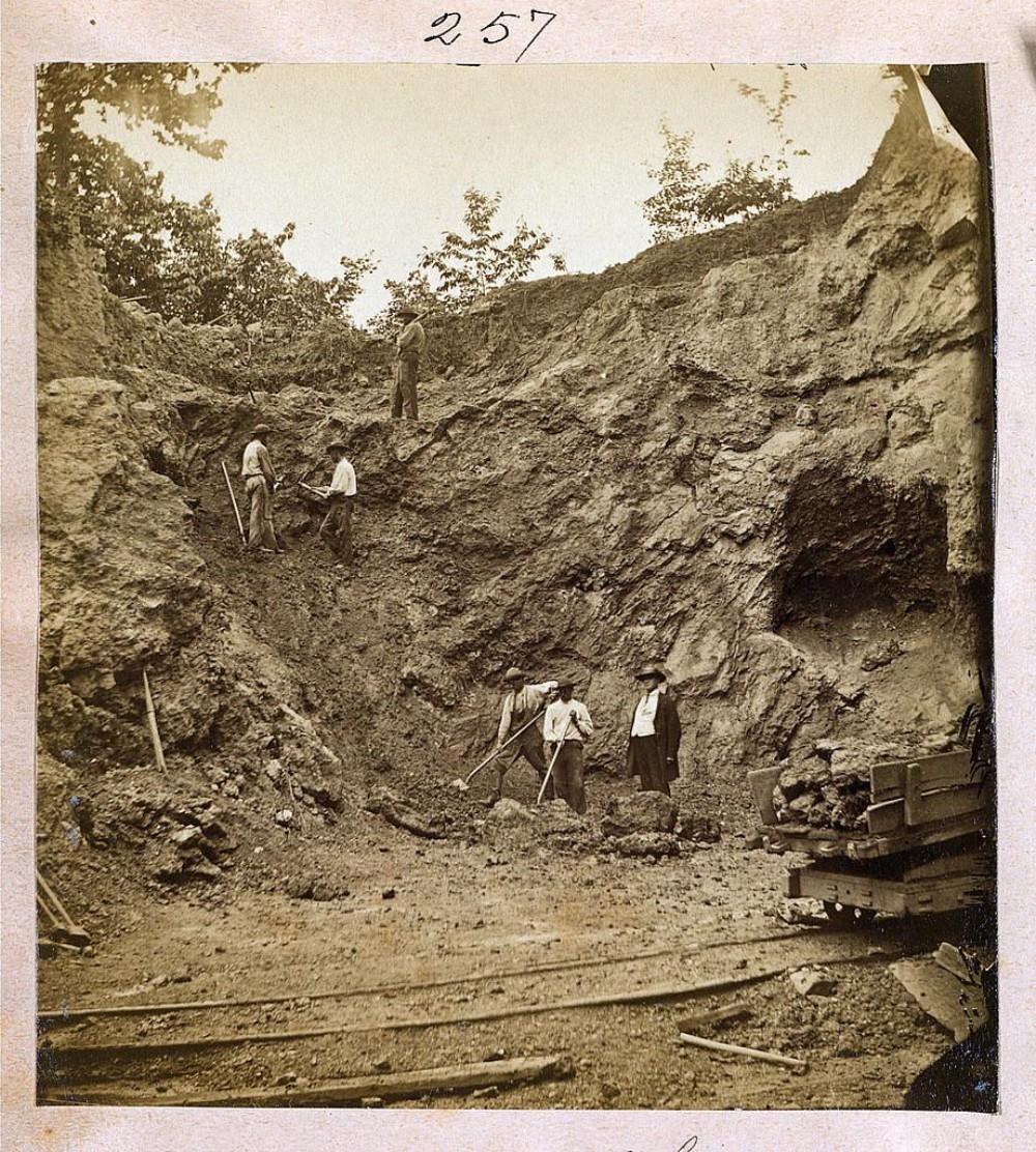 Shows several men working on hillside at the ore bank at Elizabeth Furnace in Virginia.