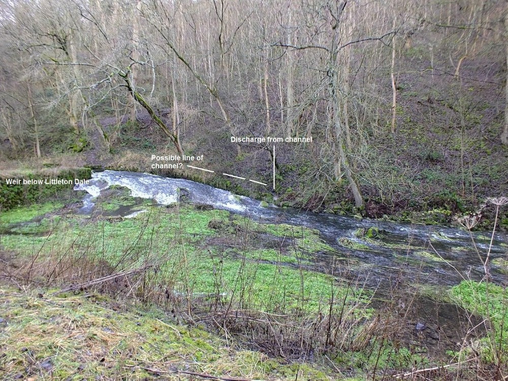 The weir wall is on the left of the photo, the discharge point is in the centre of the photo, and there appears to be the faint line of a possible overgrown/collapsed channel.
