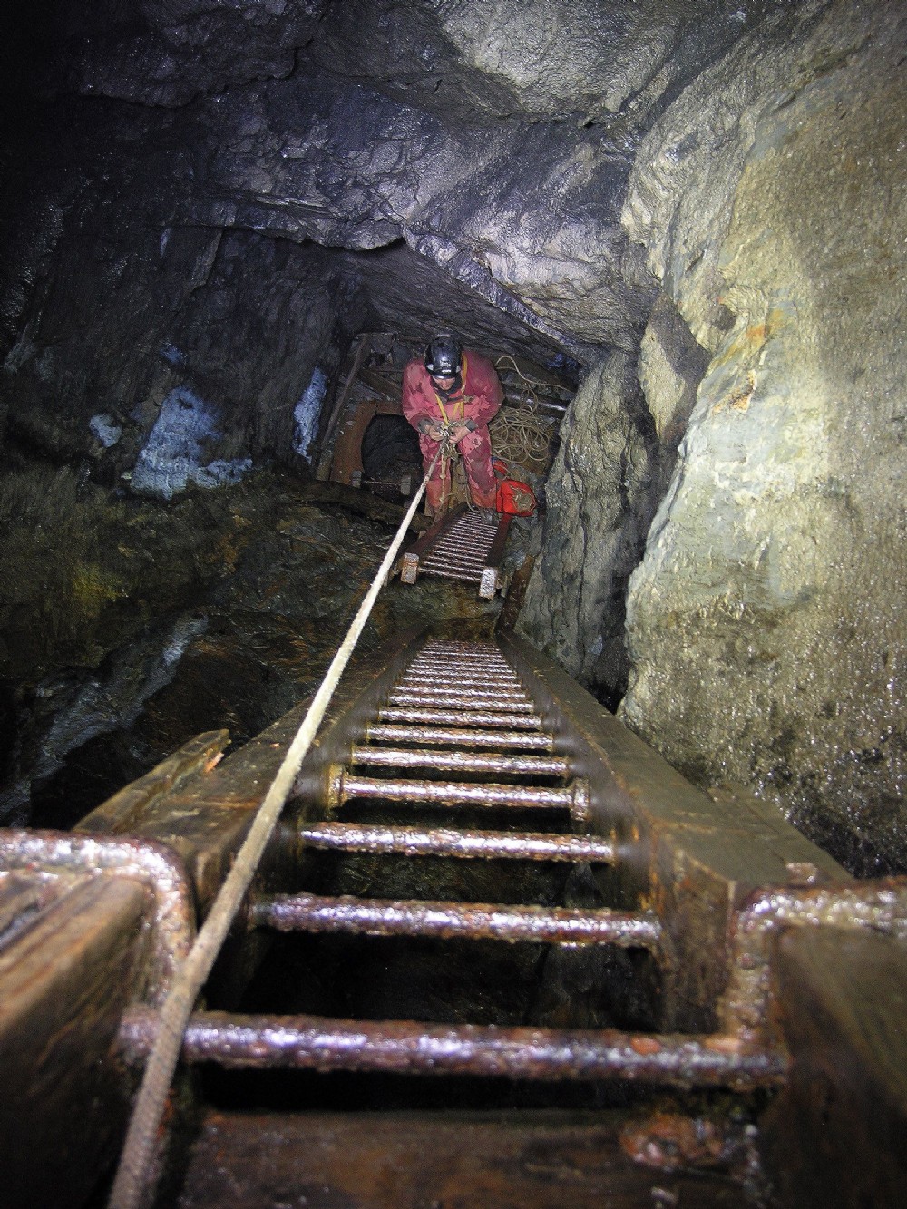 Nimrod ascends the ladders from the intermediate level to return to the shallow adit level. Four ladders in total, but essential to use a rope.