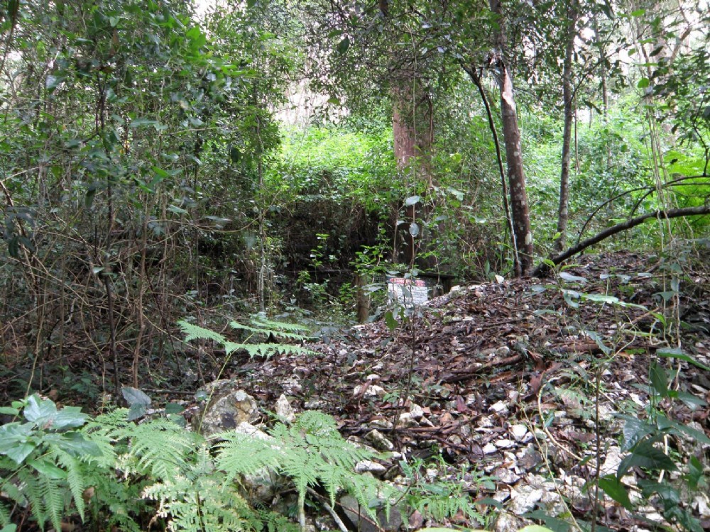 View from adjacent gully showing quartz rich waste dump and fencing around mouth of shaft.
