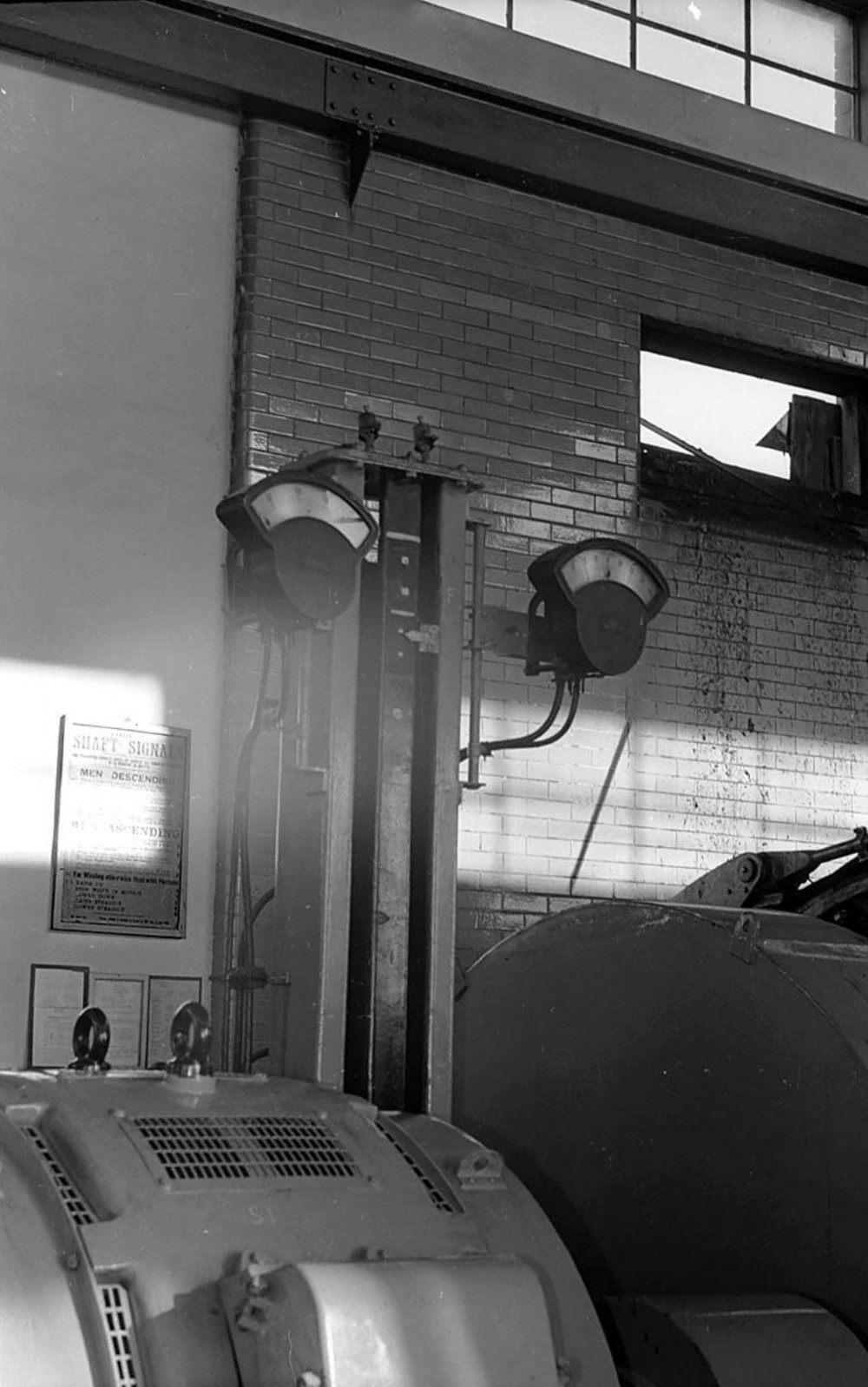 No.1 electric winder. Winding engine telltale and power/speed control meters. Hole for winding rope visible in top background. [Picture taken 15th July 1978]