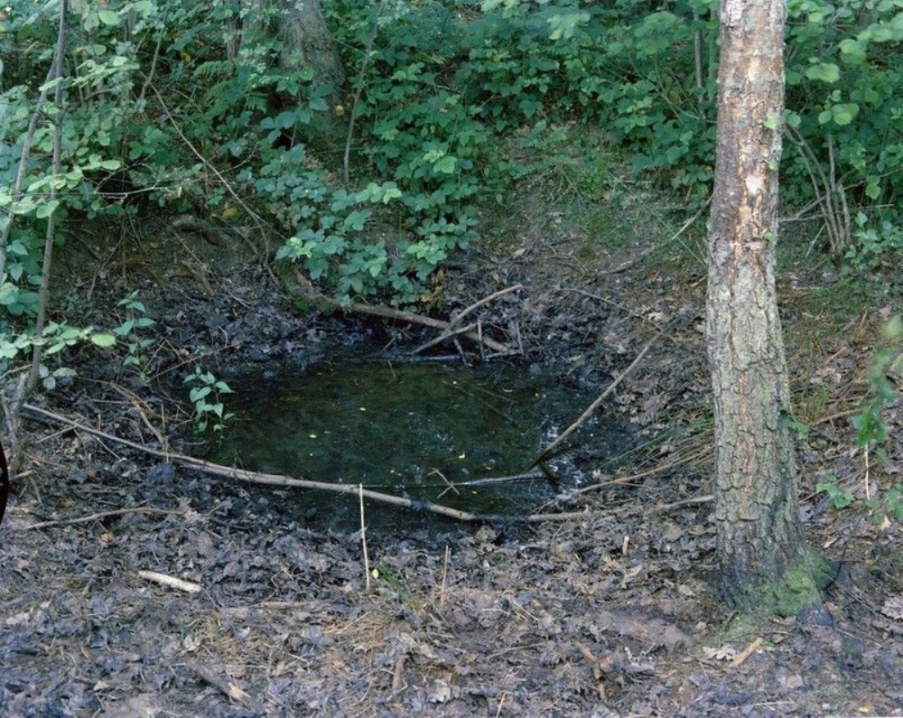 Description: Minepit Copse, 5/8 m. S. by E. of Wormley Hill. Looking S. Old working for clay-ironstone. This surface depression, partially filled with stagnant water, indicates the site of a shaft or 'bell-pit' dug to obtain clay-ironstone, used as an iron-ore in the time of the Wealden iron industry. The shaft would have been re-filled with excavated clay, the settling and compaction of which has produced the depression.