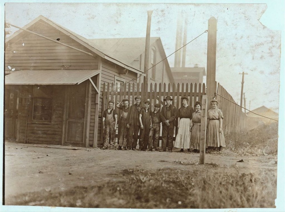 Noon Hour, Republic Iron & Steel Co., Muncie, Ind. A few go home to lunch. (Couldn't get inside, Hine, Lewis Wickes, 1874-1940, photographer.) Location: Muncie, Indiana.