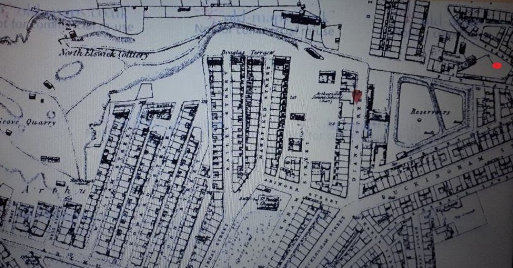 Interesting map showing North Elswick in completely different location, Now present day Liddle Road within a housing estate at approx. grid ref NZ234644. The red dot top left is the site location but listed on the map as "Firebrick Manufacturing" although Pit street and Pit Lane are either sides of the site.