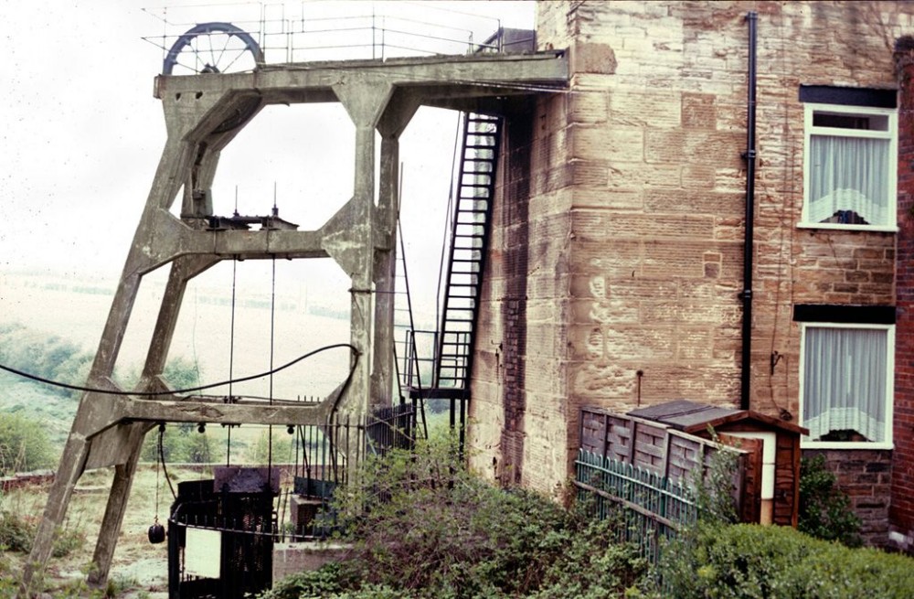 View from the road of the North headframe and beam engine house, 6th May 1984. (Scanned from a damaged slide, image restored as much as possible in Photoshop).