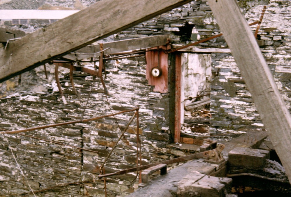 A view of the remains of the stage and drum beams. The door is the entrance to the motor house. Beside it is the old ammeter.