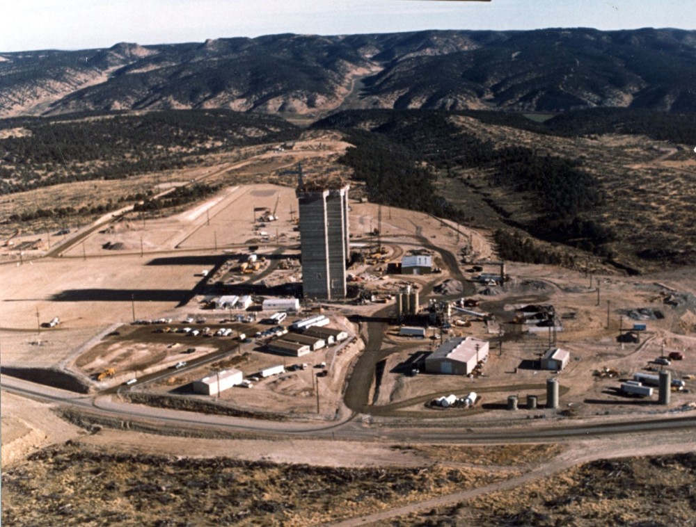 Oblique aerial view of surface site development on oil shale prototype tract C-b. Rio Blanco County, Colorado. September 27, 1978.