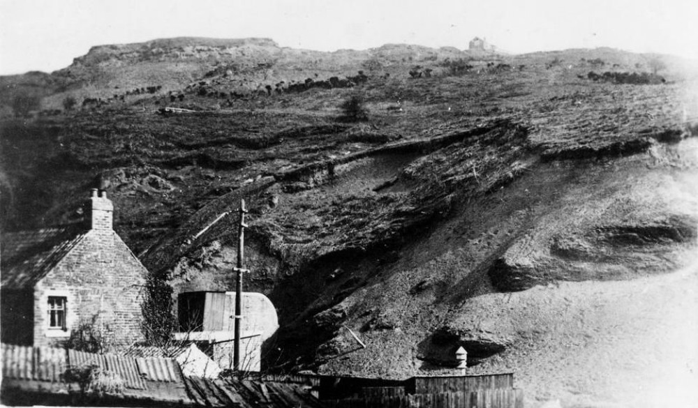 Taken sometime after 1910, behind the telegraph pole and set into a cutting in the quarry face is the upper part of small brick and concrete structure.