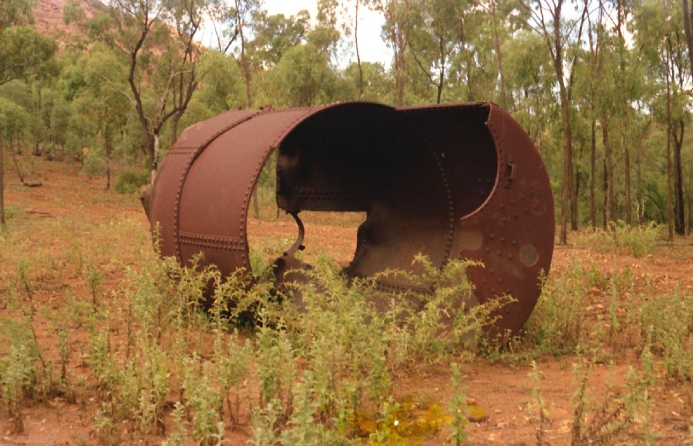 The remains of an old Cornish boiler on the flat below the old mill site on the south side of the hill. This wa sprobably buried under waste or the old low grade ore dump.
