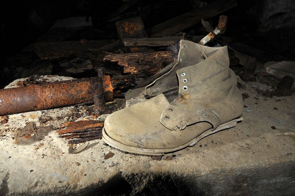 Old boot on the concrete foundations of the 1950s winding engine hut in the Man Engine chamber (South East & West Lode). [October 2012]