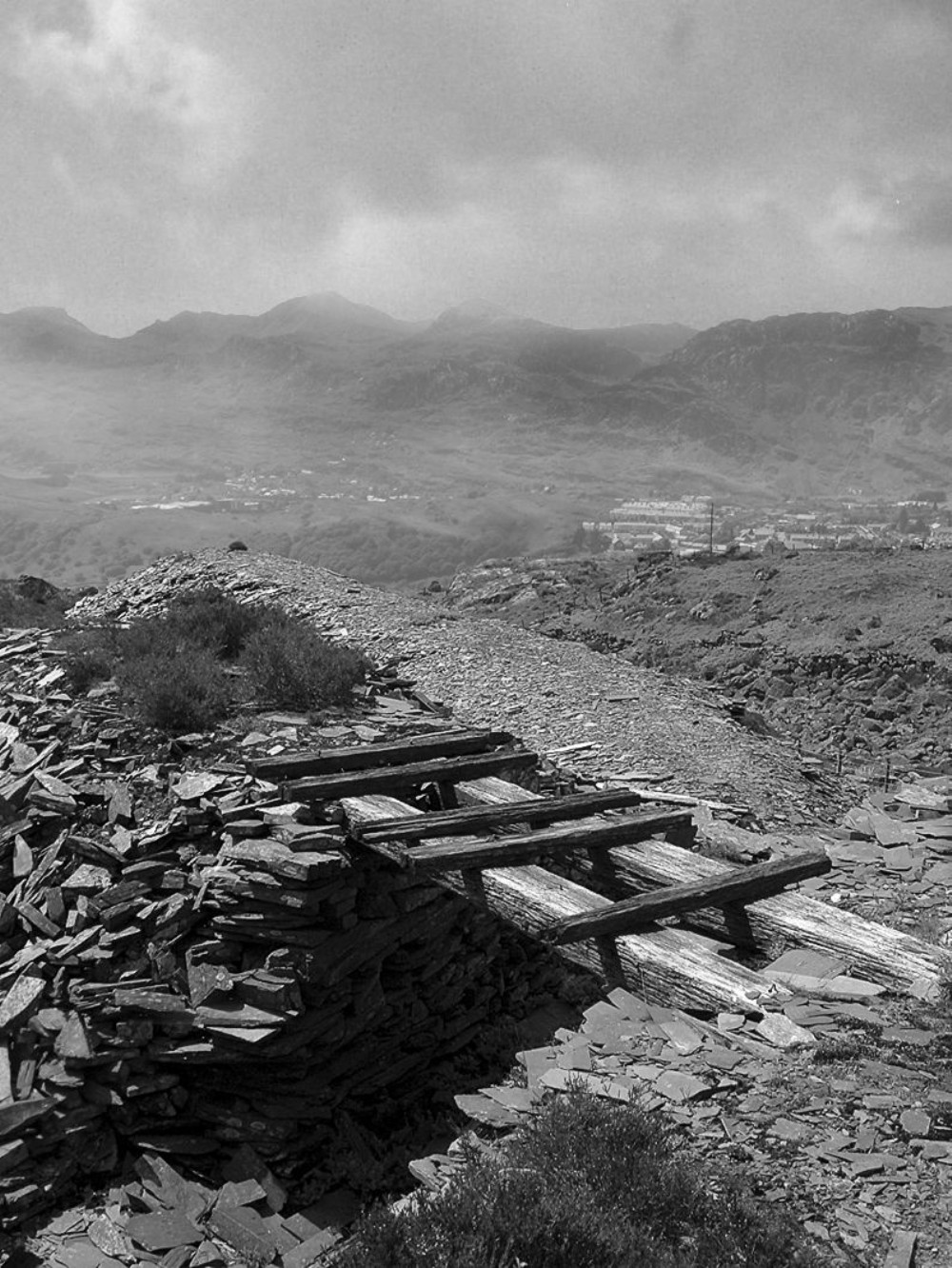 At the lower level of the tips, just above the incline from Manod. Blaenau Ffestiniog in the right distance.
