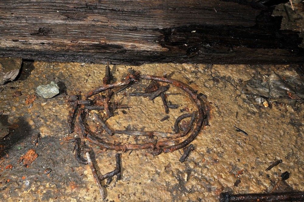Metal items - possibly remains of a wooden bucket, amongst the debris of the 1950s winding engine hut in the Man Engine chamber (South East & West Lode). [October 2012]