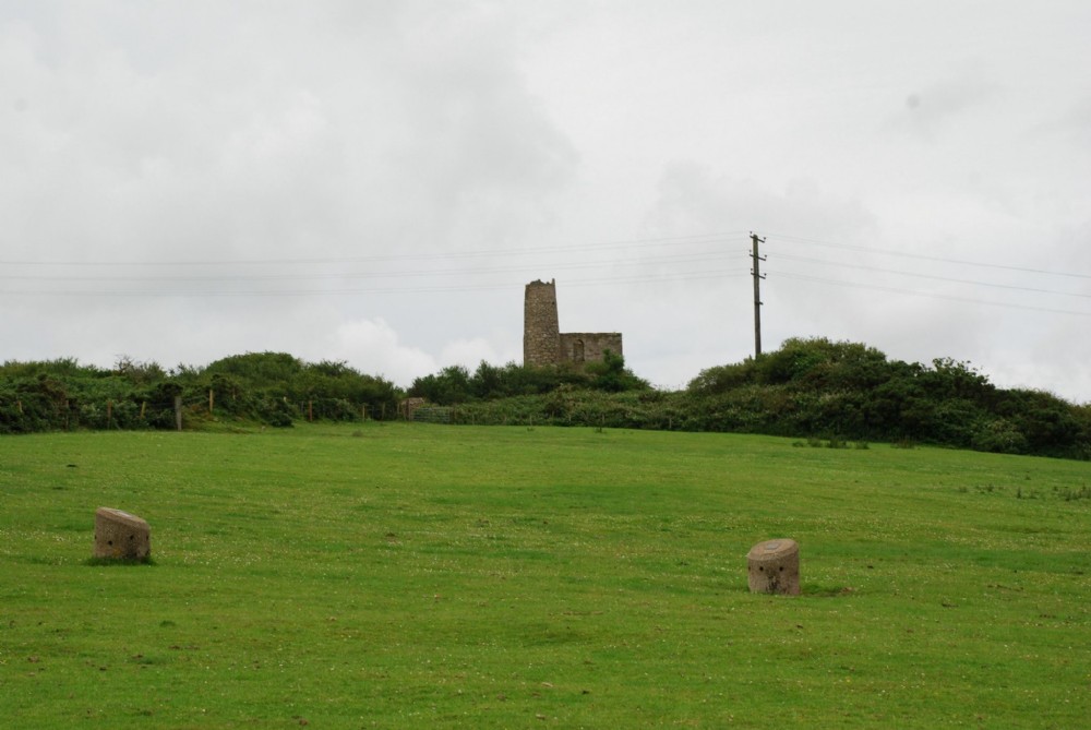 Wheal Grenville New Stamps to the north. These are proclaimed as unknown shafts but Kenneth Brown identifies them as East Wheal Grenville Old Engine Shaft. There was a pumping engine on the left hand one and the other was a whim shaft.